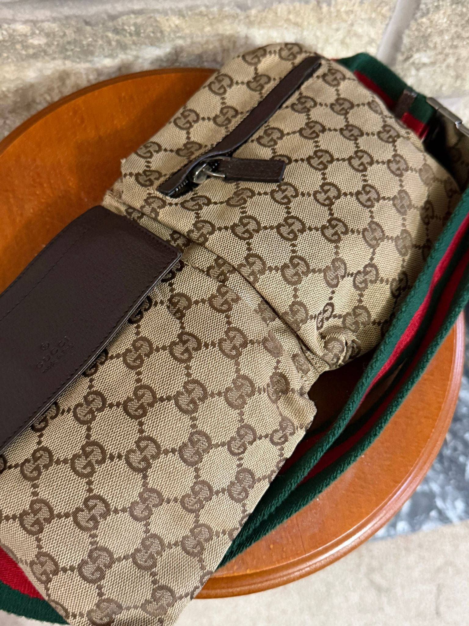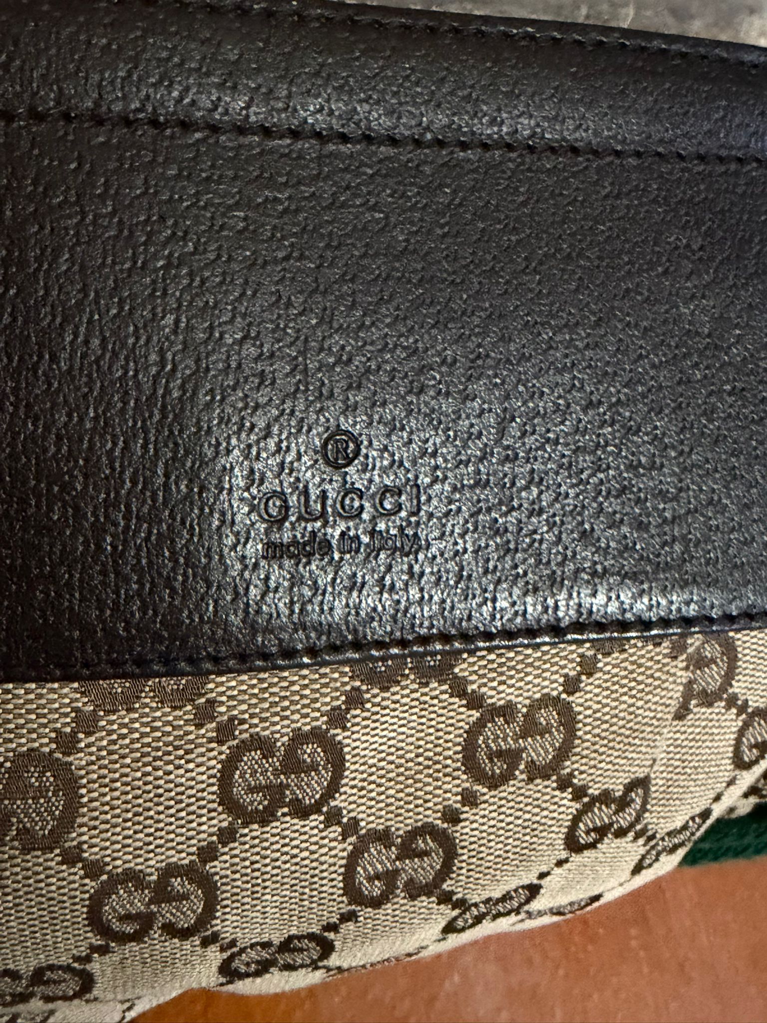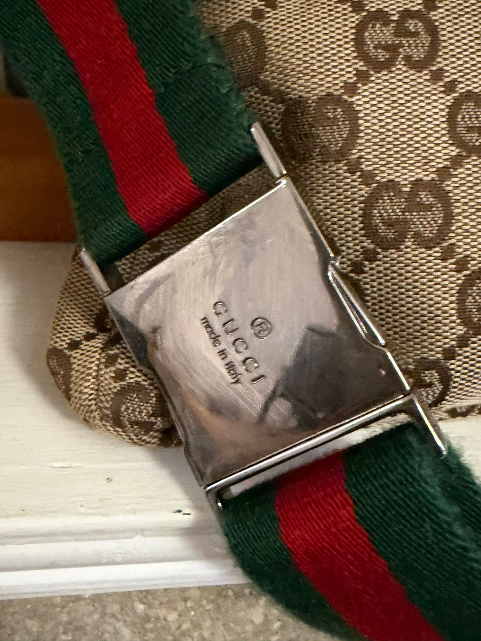 Colour- Brown/ Beige on the exterior, brown interior, green and red belt with silver hardware.