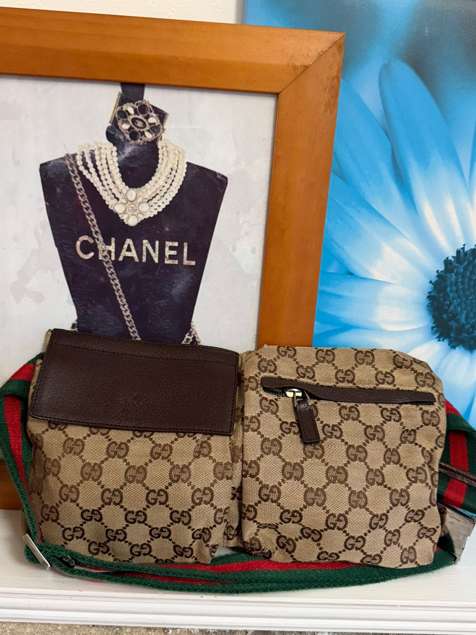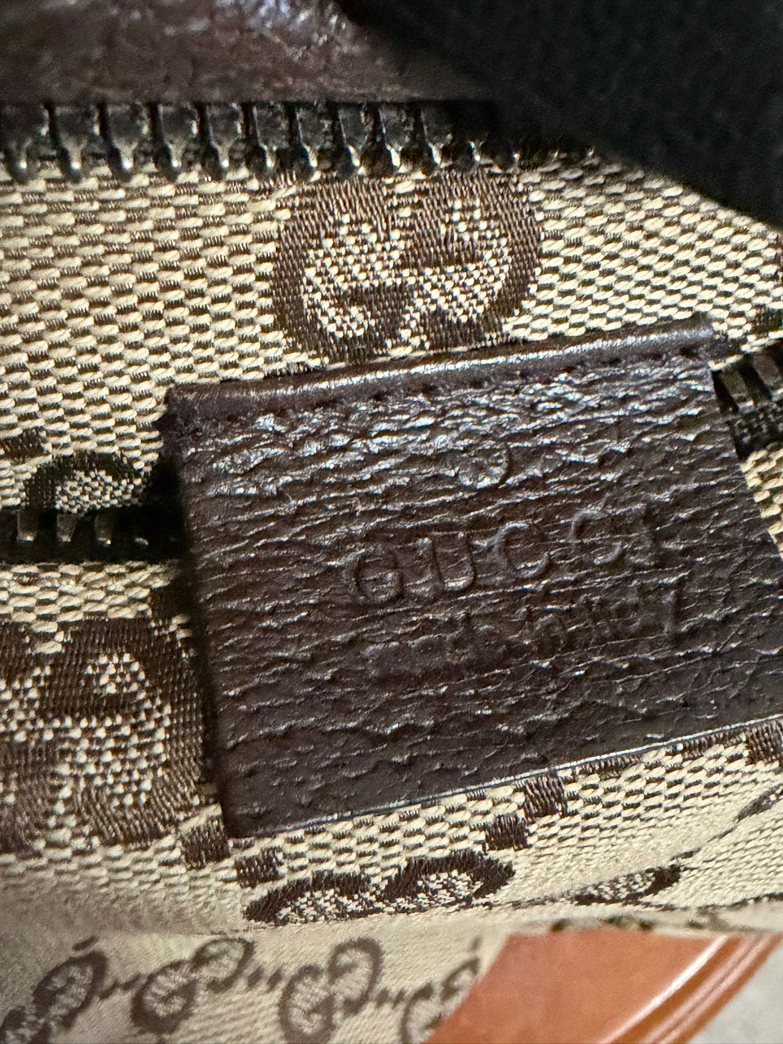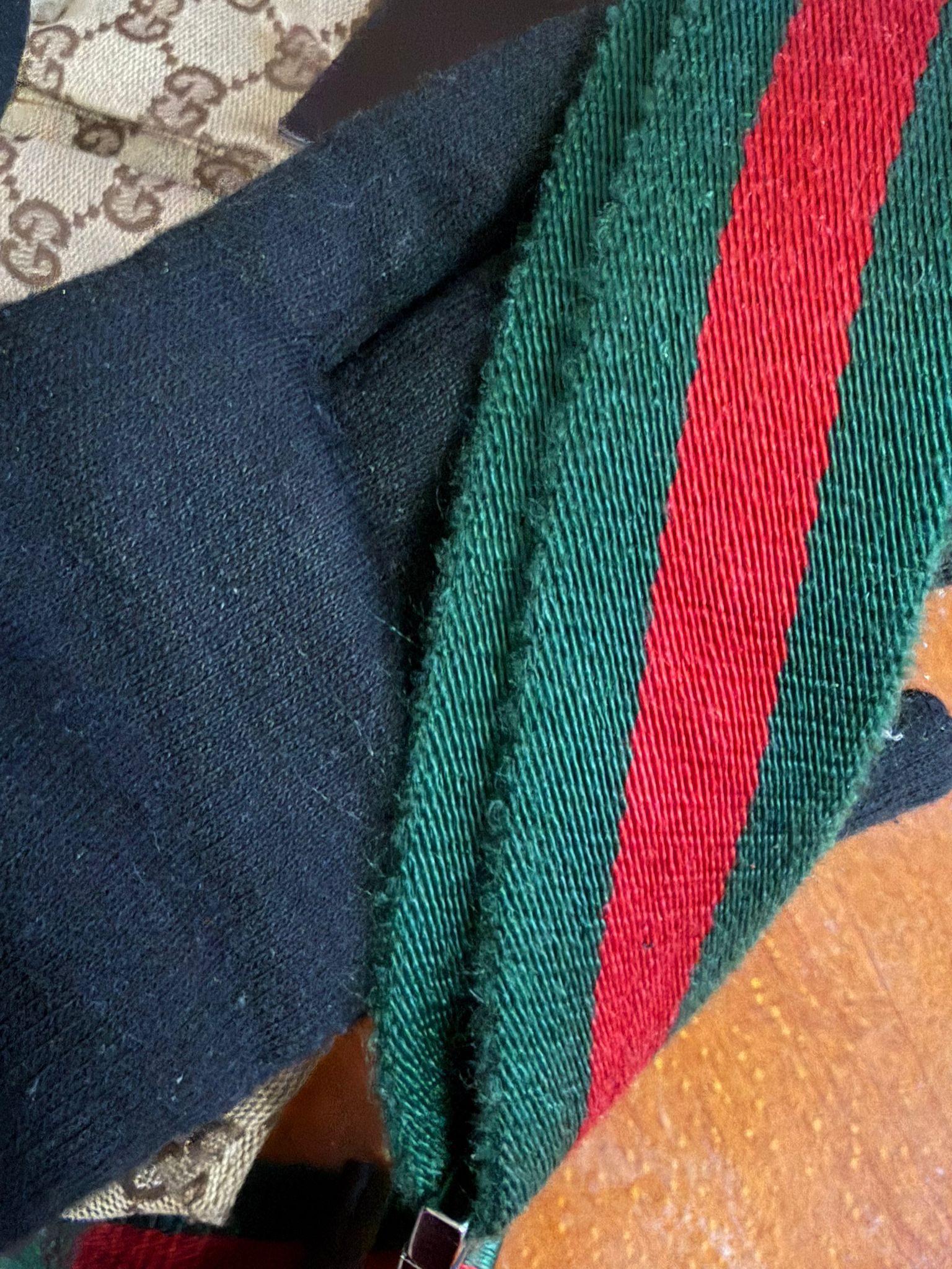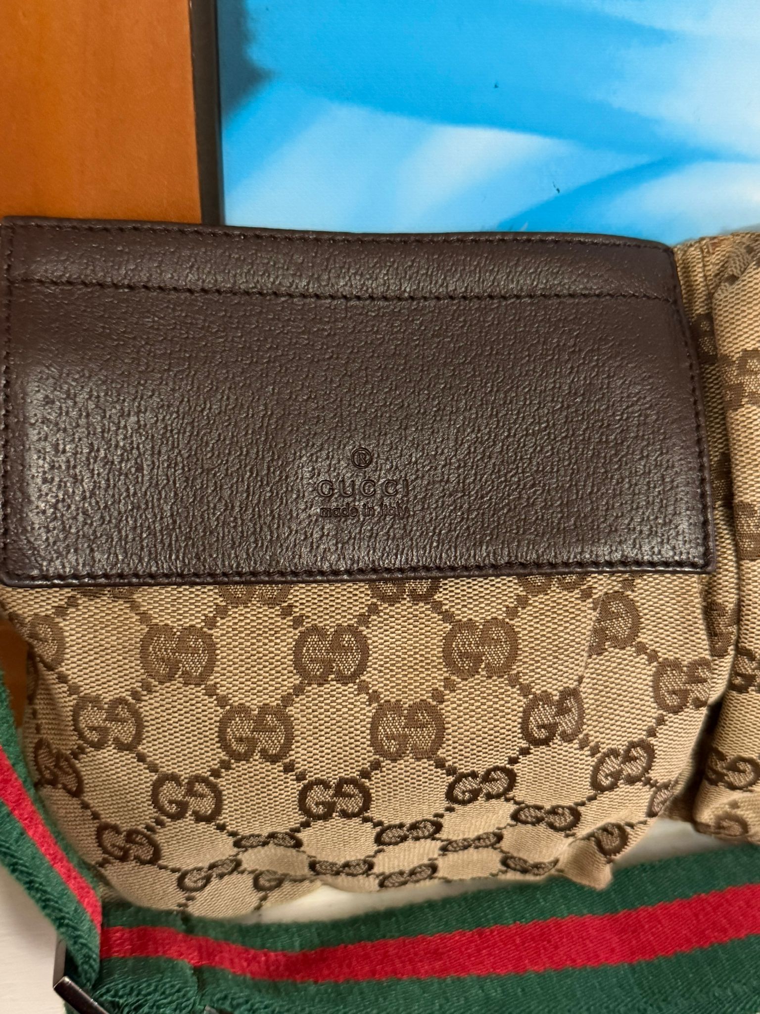 Colour- Brown/ Beige on the exterior, brown interior, green and red belt with silver hardware.